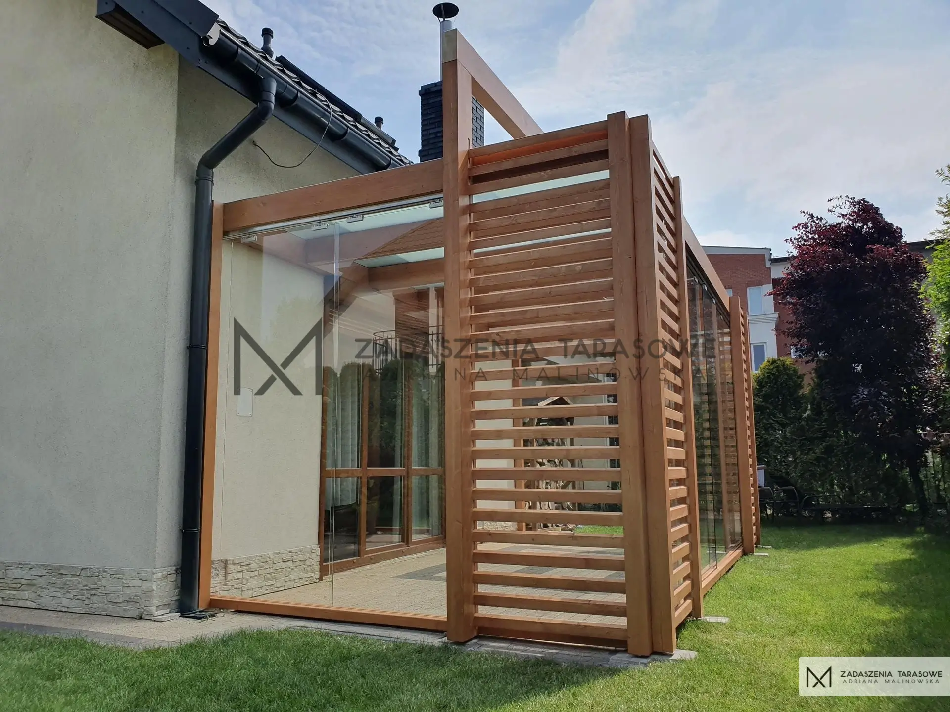 Większą funkcjonalność to zadaszenie tarasu z belką nad dachem nowoczesne zyskuje dzięki szklanym, przesuwnym panelom. Umieszczenie ich na prowadnicach umożliwia szybkie i łatwe zamknięcie lub otwarcie przestrzeni w zależności od warunków atmosferycznych. Dach wykonany został z mlecznego szkła hartowanego, które wprowadza do wnętrza półcień w czasie największych upałów. Pod takim dachem można również zawiesić materiał lub zainstalować firany w ścianach, lub żaluzje.