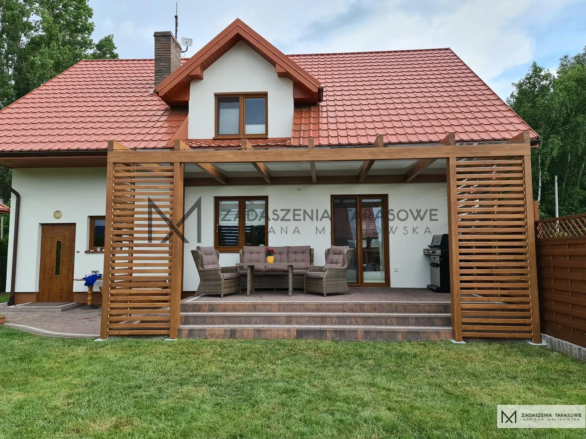 Takie nowoczesne tarasy mają szansę przeobrazić się w wygodne, komfortowe strefy relaksu, będące przedłużeniem wewnętrznego salonu. Taki charakter finalnie zyskało to zadaszenie z drewna na taras. Meble rattanowe tworzą wygodny kącik idealny do popołudniowego relaksu, a wielofunkcyjny grill ukryty w rogu zabudowy zapewnia właścicielom i ich gościom przyjemny i smaczny posiłek.