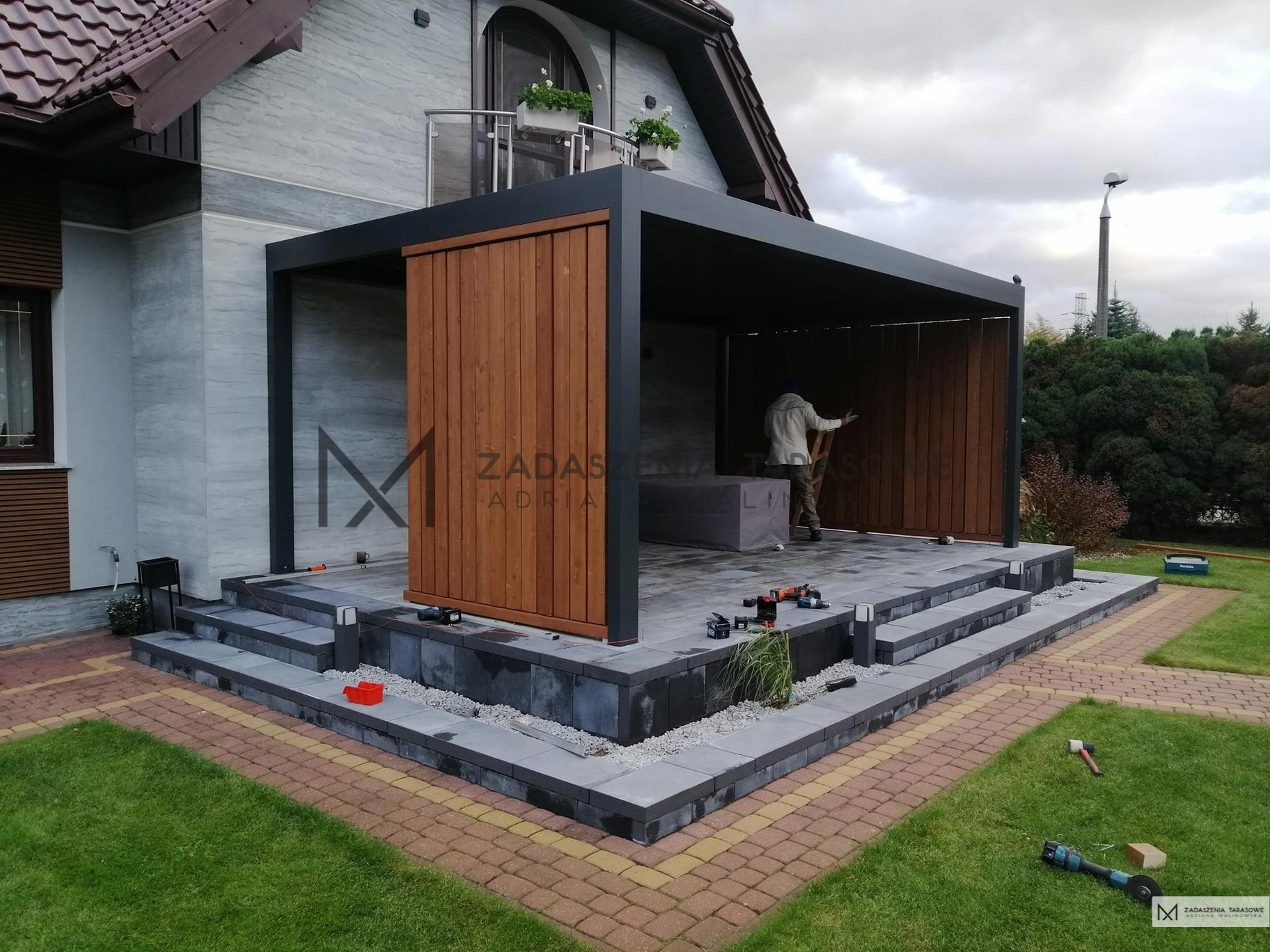 Szkielet konstrukcji wykonaliśmy z belek drewnianych w grafitowym odcieniu. Dzięki temu zadaszenie z lamelami jest nowoczesne i wyraziste. Barwa szkieletu pasuje do szarej elewacji budynku oraz kamiennej podłogi w tym samym kolorze. Tworzy z nimi jednorodną i spójną zabudowę.