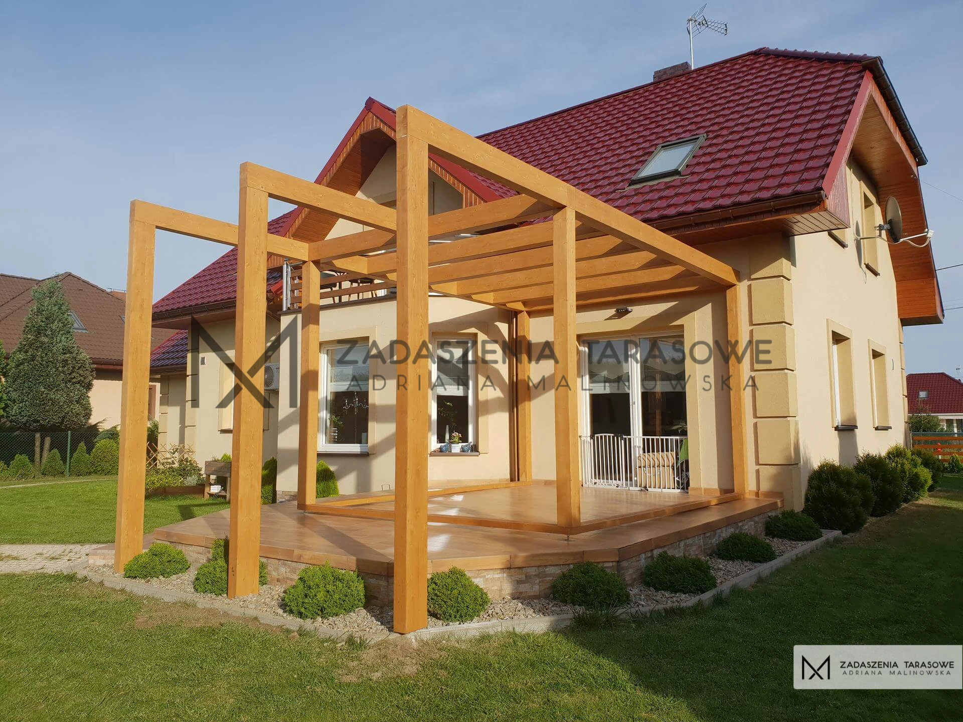 Szkielet powstał z drewna w kolorze złotego dębu. Jasny odcień pasuje do podłogi tarasu oraz do stolarki okiennej i elewacji budynku. Jest klasyczny. Jednocześnie o różnych porach dnia potrafi przybierać inny odcień, co zwiększa estetykę zabudowy. Nowoczesny dach tarasowy z drewna zyskuje współczesnego charakteru dzięki ułożeniu belek. Przez to, że tworzą one nieco futurystyczny kształt. Na wysuniętej pergoli zawieszony jest hamak, dzięki niemu inwestorzy będą mogli spędzić miło czas w ogrodzie ciesząc się kontaktem z naturą.