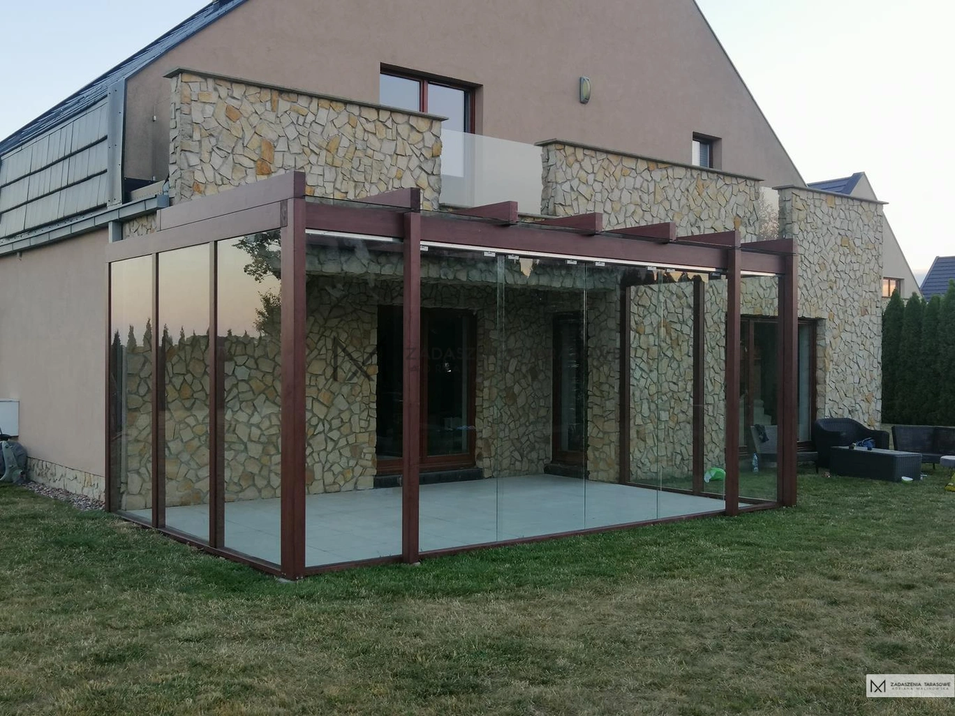 Szkielet powstał z prostych belek kolorystycznie dopasowanych do rustykalnego charakteru domu. Istotnym elementem jest szkło hartowane. Pokryliśmy nim zarówno trzy ściany, jak i dach drewnianego zadaszenia z osłoną od wiatru. Po bokach transparentne elementy są stałe. Na froncie natomiast zastosowaliśmy panele ruchome. Umieszczone na prowadnicach pozwalają na szybkie zamknięcie lub otwarcie wnętrza. Dzięki temu zadaszenie z osłoną od wiatru ze szkła można dopasować do warunków atmosferycznych. Zsunięcie elementów chroni wnętrze przed wiatrem, deszczem oraz śniegiem. Sprawia, że drewniane zadaszenie z osłoną od wiatru może być wykorzystywane od wczesnej wiosny aż do później jesieni. Przy niskiej temperaturze wnętrze można dodatkowo ogrzać piecykiem elektrycznym.