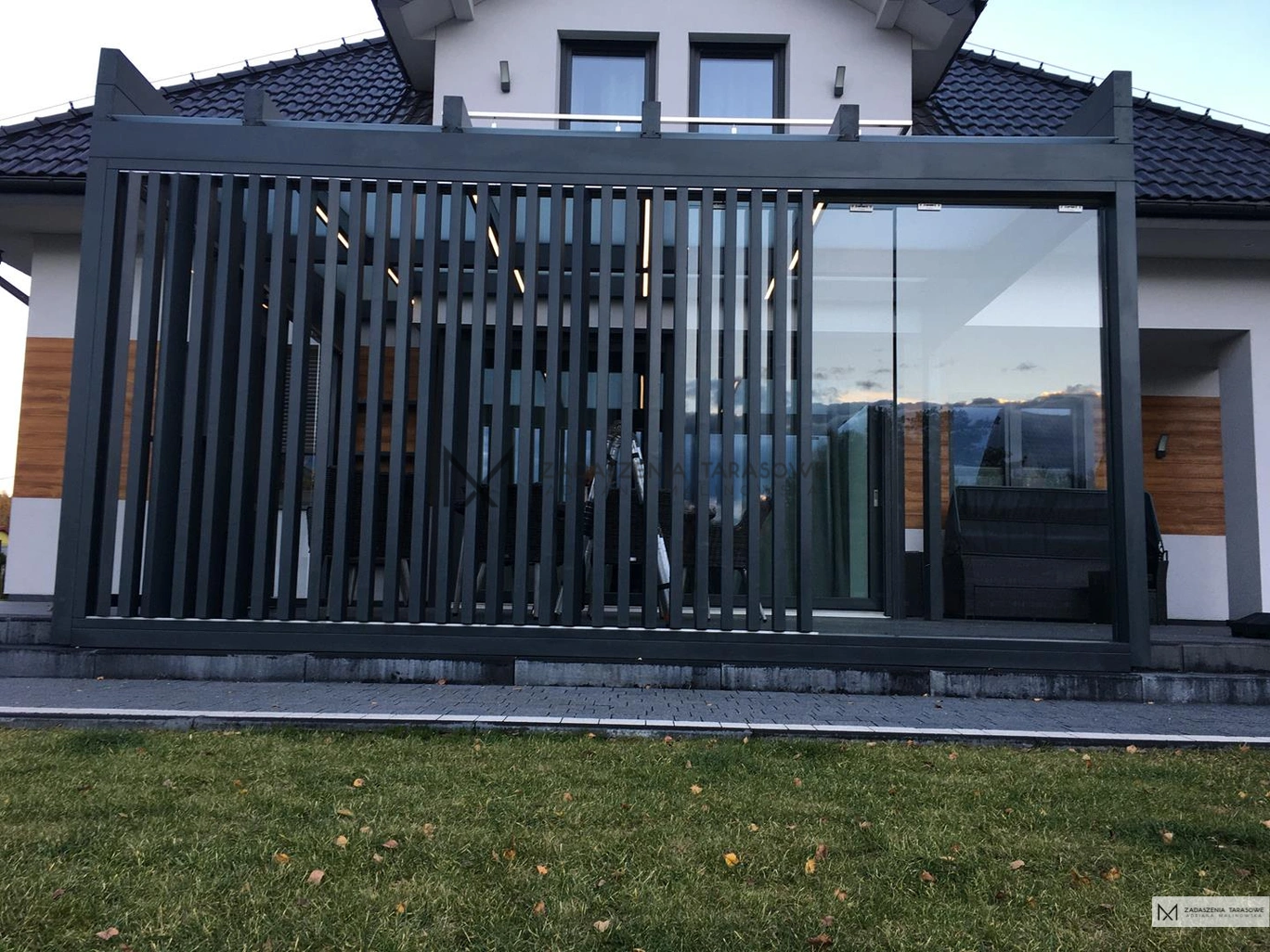 Zadaszenie z zabudową ścian lamelami jest funkcjonalną i elegancką przestrzenią, która umożliwia korzystanie z tarasu przez większą część roku. Właścicieli zaprojektowali wnętrze w formie salonu zewnętrznego, w którym znalazło się miejsce na wygodne meble wypoczynkowe. Zadaszenie z zabudową ścian stało się przyjemnym miejscem na popołudniową kawę i na spotkanie z przyjaciółmi przy grillu, który stanął niedaleko tarasu. Stosując różne rozwiązania na zadaszenia tarasu trzeba wziąć pod uwagę wszelkie funkcjonalności Ta konstrukcja miała za zadanie osłonić inwestorów od słońca, projekt Zadaszenie tarasu z pergolą, miał jednak pozwolić na swobodne obcowanie z naturą.