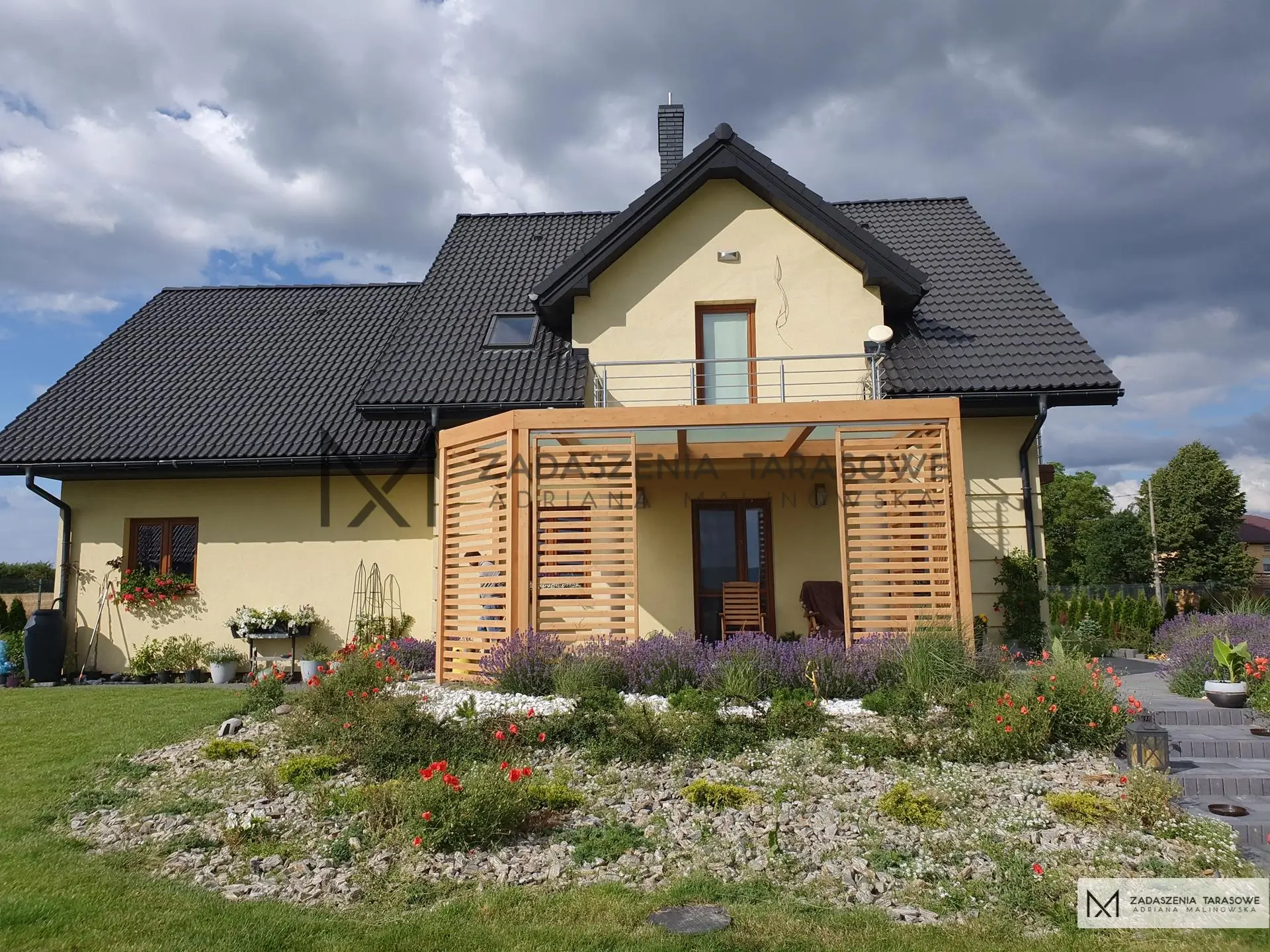 Dokładnie taka jest ta zabudowa balkonu. Minimalistyczna konstrukcja jest podstawą projektu tej wiaty. Zadaszenia drewniane bywają wizualnie ciężkie. Jednak w tym przypadku zastosowaliśmy ciepły, złoty kolory, który sprawia, że szkielet nabiera lekkości. Barwa dopasowana została do elewacji budynku. Fantastycznie też komponuje się ze stolarką okienną oraz ciemną dachówką. Mimo, że jest to nowoczesne zadaszenie tarasowe, to wtapia się w nieco klasyczne otoczenie.