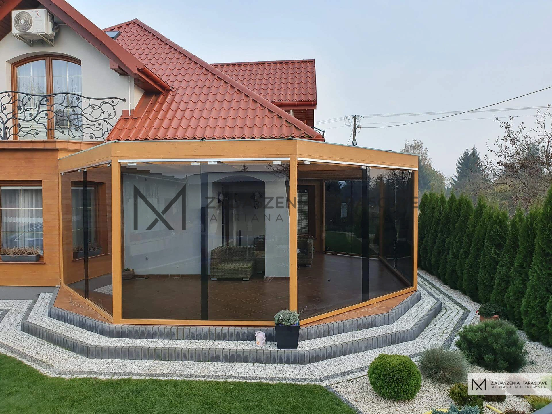 Oto jedno z największych wyzwań, z którymi mieliśmy przyjemność się zmierzyć. Problemem nie były imponujące rozmiary zabudowy, ale forma, jaką miało mieć to ładne zadaszenie ze szkłem grafitowym. Projekt zakładał bowiem wykorzystanie nieregularnego podłoża tarasu z płytek ceramicznych i stworzenie konstrukcji o pięciu szerokich bokach wypełnionych szkłem. To zawsze niesie ze sobą wyzwanie niezwykle precyzyjnych pomiarów, a także ostrożności w transporcie. Udało się i powstało przestronne, komfortowe, zadaszenie tarasu z dymionym szkłem.