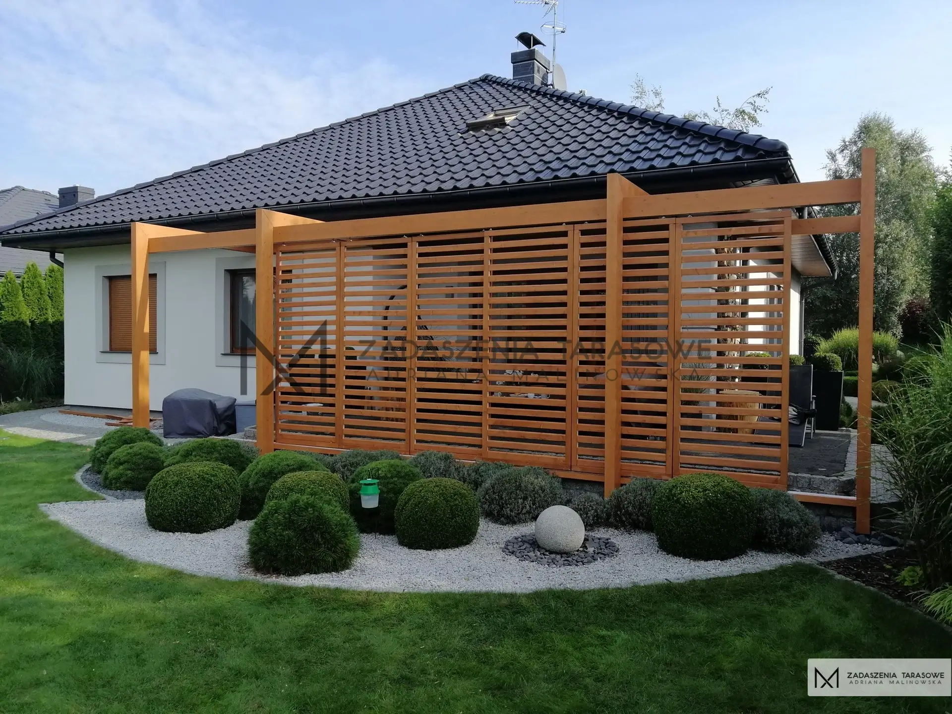 Nowoczesne pergole tarasowe są wielofunkcyjne. Z jednej strony mają na celu tworzyć przestrzeń do odpoczynku, z drugiej natomiast upiększać ogród i stanowić łącznik pomiędzy nim a domem. Dlatego muszą być nie tylko praktyczne, ale też ciekawe, estetyczne i dopasowane do otoczenia. Tak jest w tym przypadku. Konstrukcja stanowi główny, a właściwie jedyny element designu. Do jej budowy wykorzystaliśmy drewno w ciepłym kolorze złotego dębu. Jest to jasna, jednak niezwykle wyrazista barwa, która w tym wypadku doskonale komponuje się z fasadą budynku. Pasuje też do zielonego otoczenia domu, w którym królują krzewy i niewielkie drzewa.