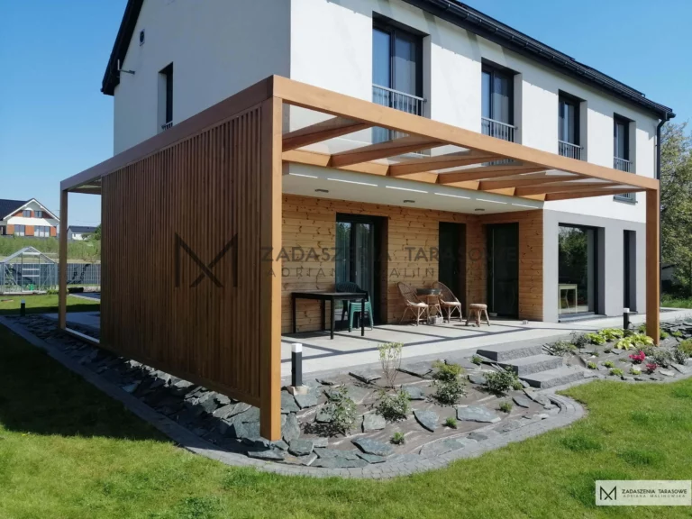 Nowoczesna pergola tarasowa mocowana do struktury budynku jest przedłużeniem domowego salonu.